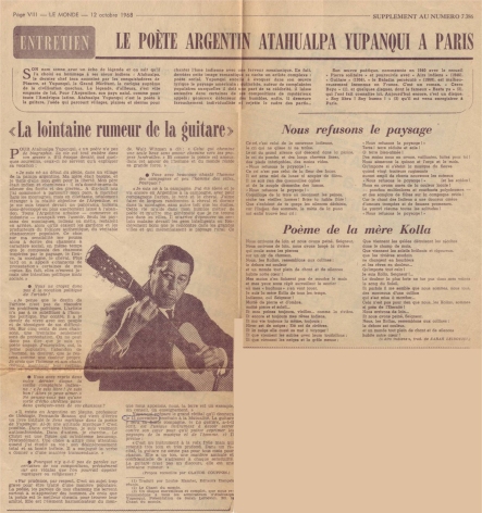Al regreso de Atahualpa Yupanqui en París en 1968, el diario "Le Monde" publicará una larga nota: "El poeta argentino Atahualpa Yupanqui en París"